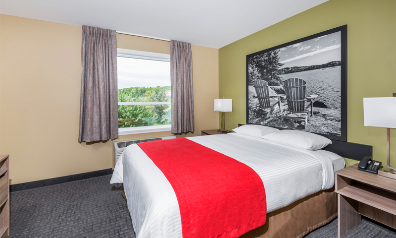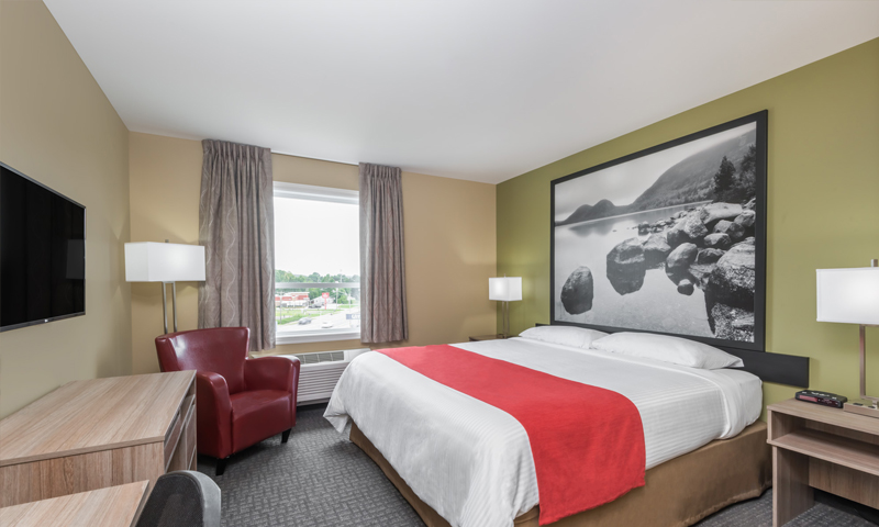 Chambre non-fumeur avec 1 très grand lit, accessible en fauteuil roulant, déjeuner continental et Internet sans fil gratuits, téléviseur HD, réfrigérateur, micro-ondes, douche de plain-pied avec siège, barres de sécurité et barres d'appui dans la salle de bain.