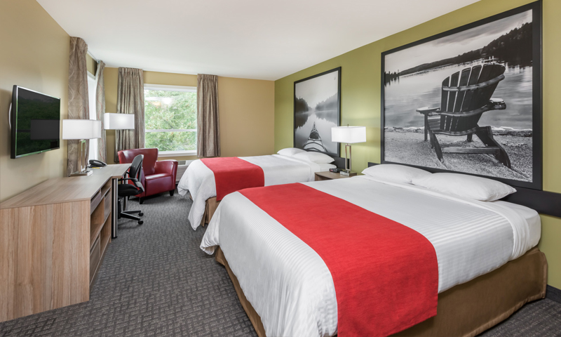 Chambre non-fumeur avec 2 grand lit, déjeuner continental et Internet sans fil gratuits, téléviseur HD, réfrigérateur et micro-ondes.