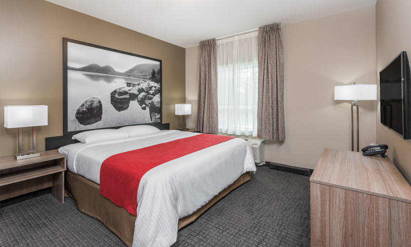Suite non-fumeurs avec 1 grand lit, divan-lit, déjeuner continental et Internet sans fil gratuits, téléviseur HD et réfrigérateur.